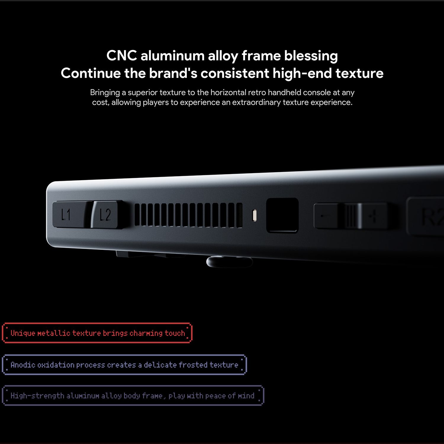The Pocket Micro features a CNC aluminum alloy frame for enhanced durability and a premium feel. Its sleek, borderless full-screen design provides an immersive viewing experience. Available in Obsidian Black, Charm Red, and Vintage Grey, the device showcases gleaming glass panels and an anodized aluminum frame, adding to its sophisticated, high-end look.