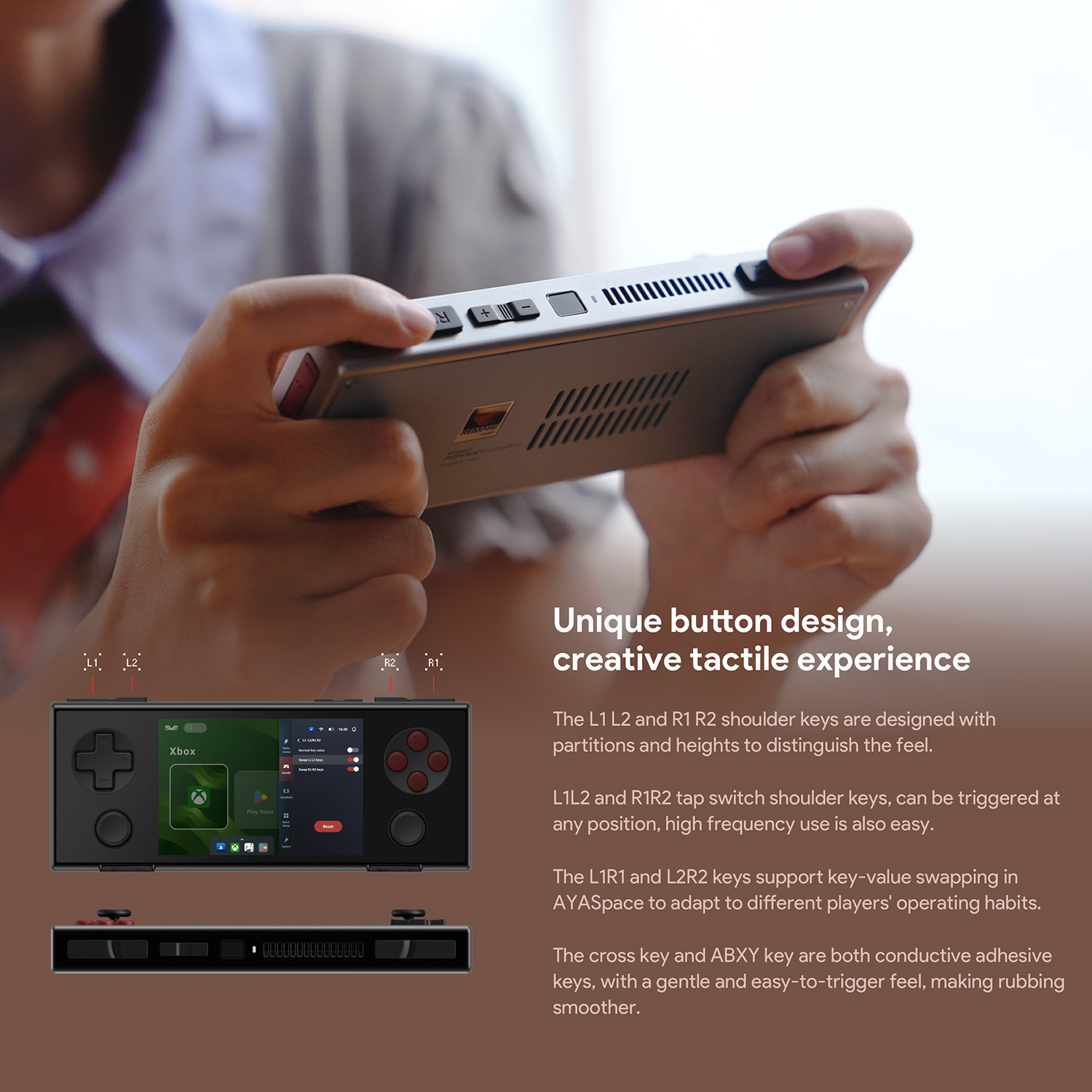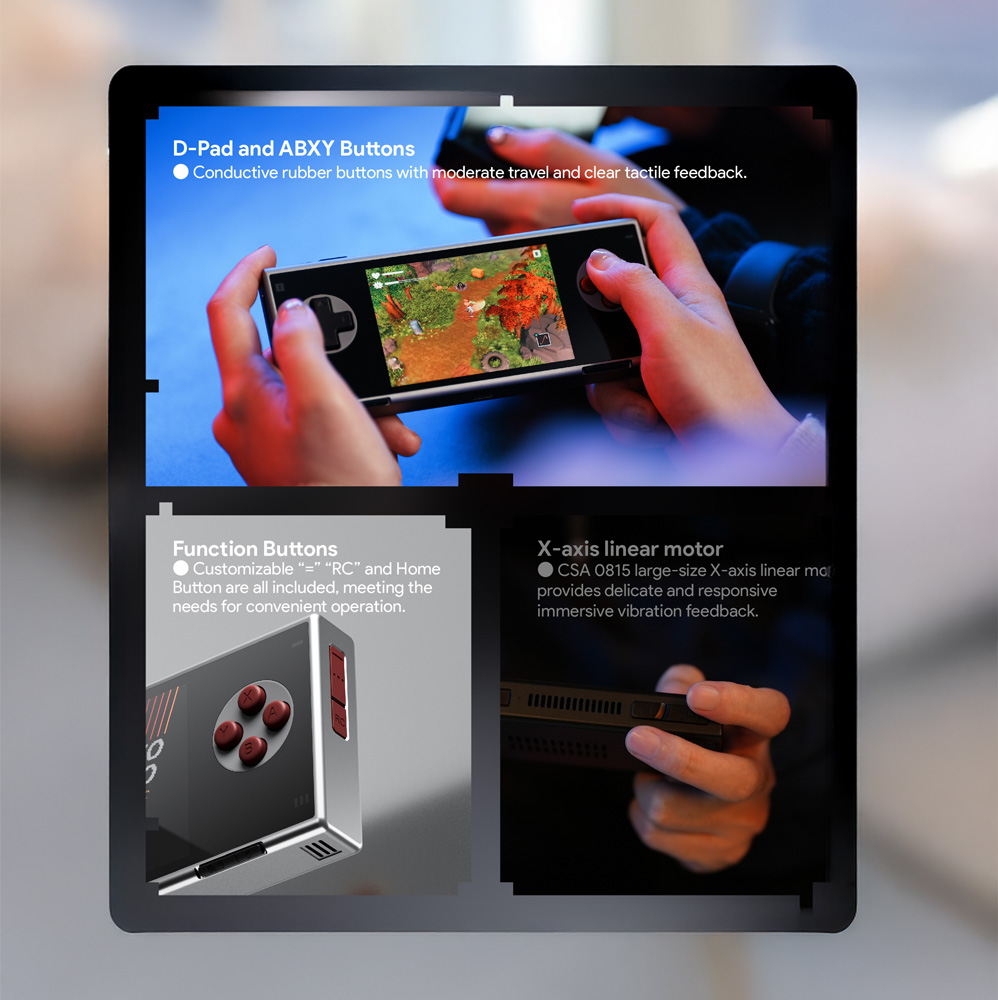 The device features an innovative control layout for comfort and responsiveness. It includes Hall joysticks, L1/L2/R1/R2 shoulder keys with varying heights, and a tap switch button. Additional controls include a master all-around handle, X-axis linear motor for vibration feedback, and a six-axis gyroscope for enhanced gaming control.