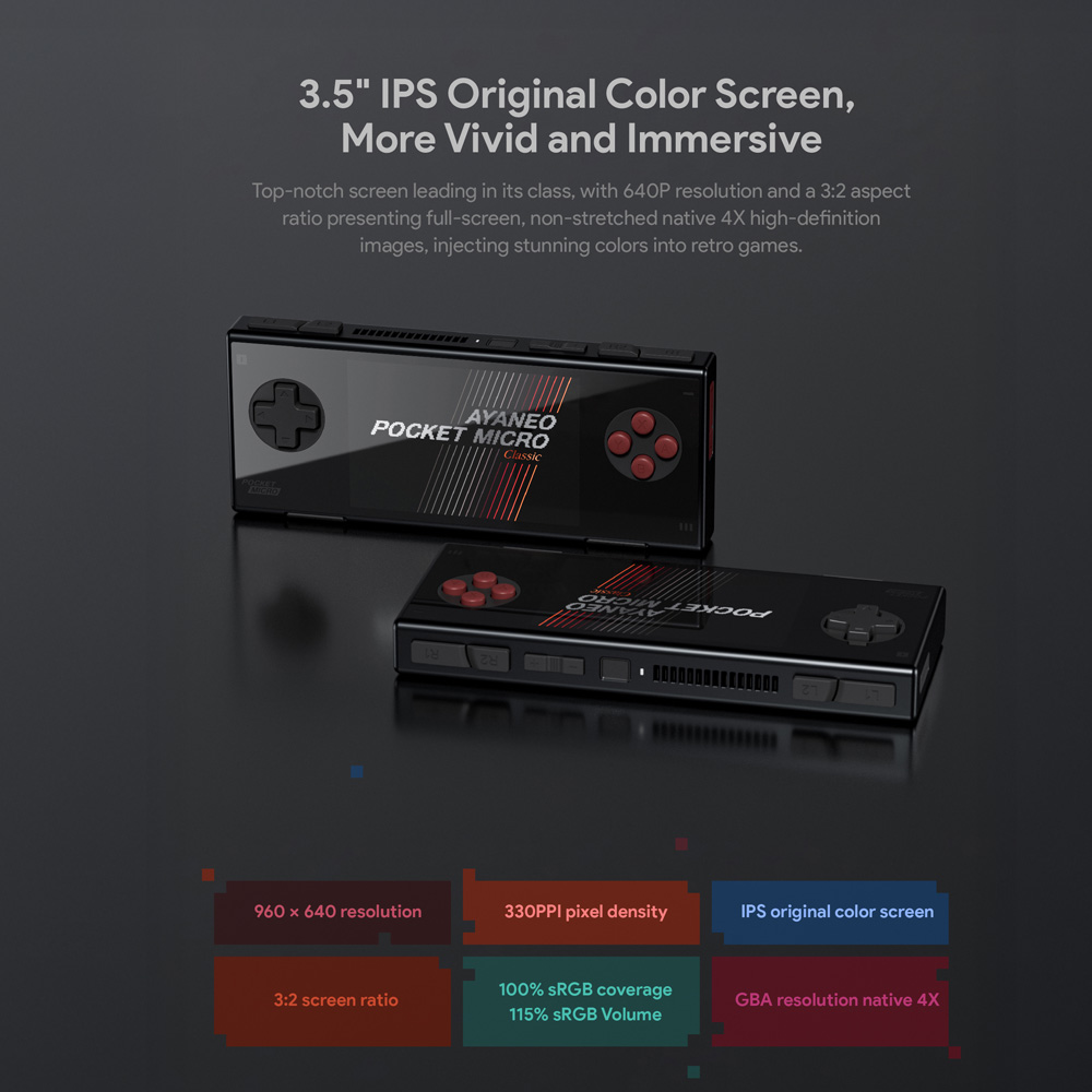 The device is equipped with a 3.5-inch borderless IPS screen, offering a resolution of 960 x 640 and a 3:2 aspect ratio. With a pixel density of 330 PPI and 100% sRGB coverage, the display provides vibrant and high-definition visuals. The 4X native GBA resolution ensures classic games maintain clarity and color without distortion.