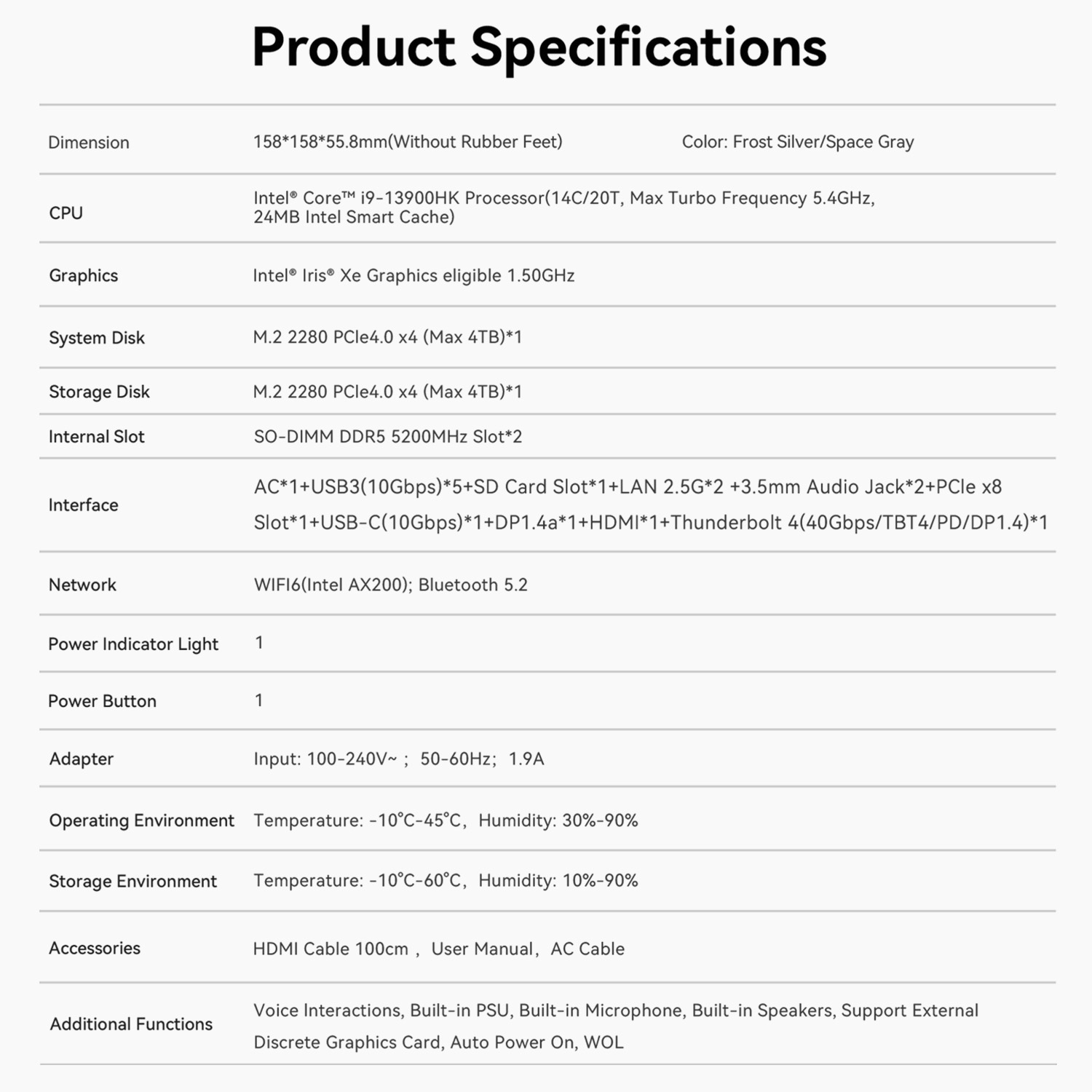 Despite its compact size (168mm × 120mm × 49mm), the GTi13 Ultra packs impressive hardware. It supports dual-channel DDR5 5200MHz RAM, expandable up to 64GB, and features dual M.2 2280 PCIe 4.0 x4 slots, each supporting up to 2TB, ensuring ultra-fast storage and seamless multitasking.
