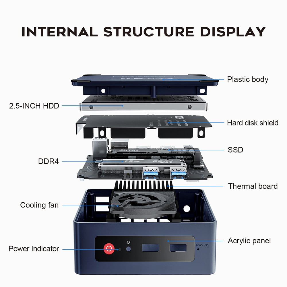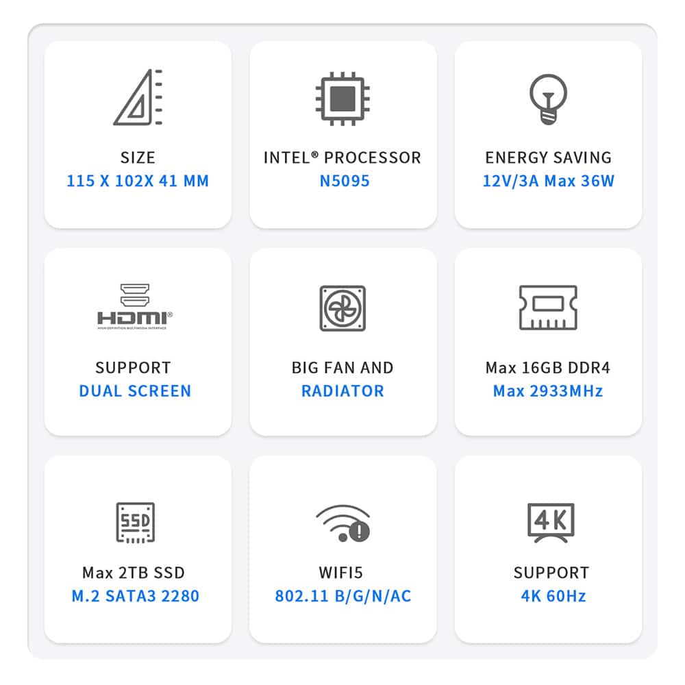 The Beelink MINI S mini computer features the 11th generation Jasper Lake Intel Celeron N5095 quad-core processor running up to 2.0Ghz. It is an energy efficient processor running at 15W, meaning that it uses less energy than a traditional desktop PC which can run as high as 600W. It saves both energy bills and the environment.