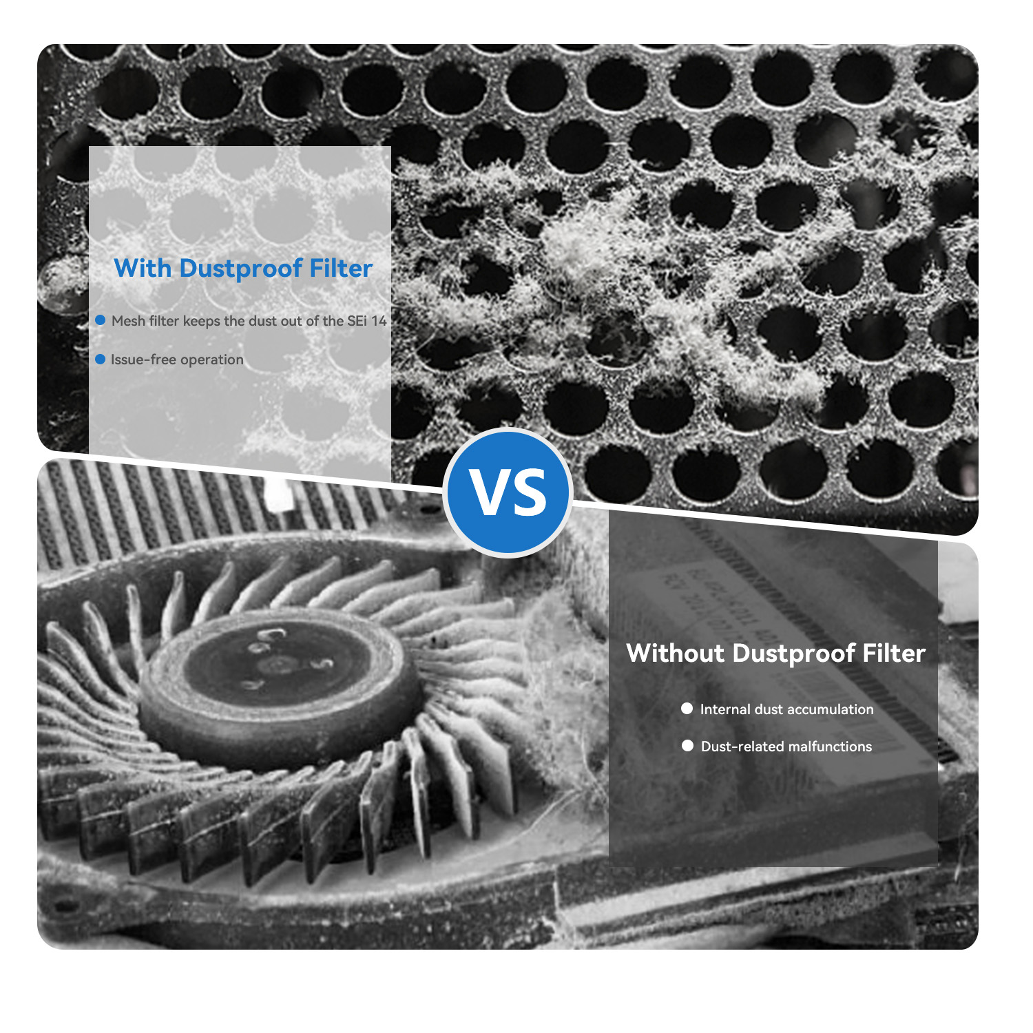 The SEi14 boasts a practical dustproof design with a high-density metal filter, ensuring longevity and consistent performance. It supports a wide operating temperature range from -10°C to 45°C and humidity levels between 30% to 90%, showcasing its versatility in various environments. Additionally, the WOL (Wake-on-LAN) auto power-on functionality allows users to manage the device remotely, adding to its convenience and flexibility.