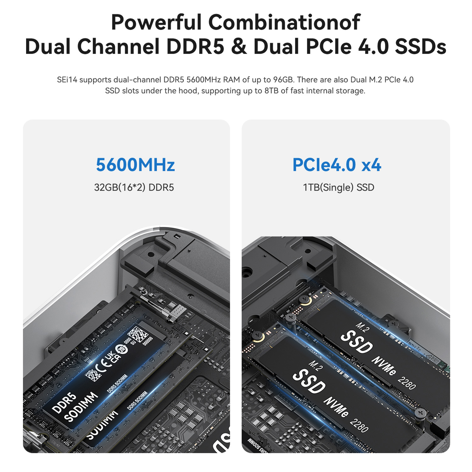 Equipped with dual-channel DDR5 5600MHz RAM, expandable up to 96GB, the Beelink SEi14 offers efficient multitasking and quick access to applications. The M.2 2280 PCIe 4.0 x4 slots provide ample storage and rapid load times, supporting up to 4TB each, ensuring your data is always at your fingertips.