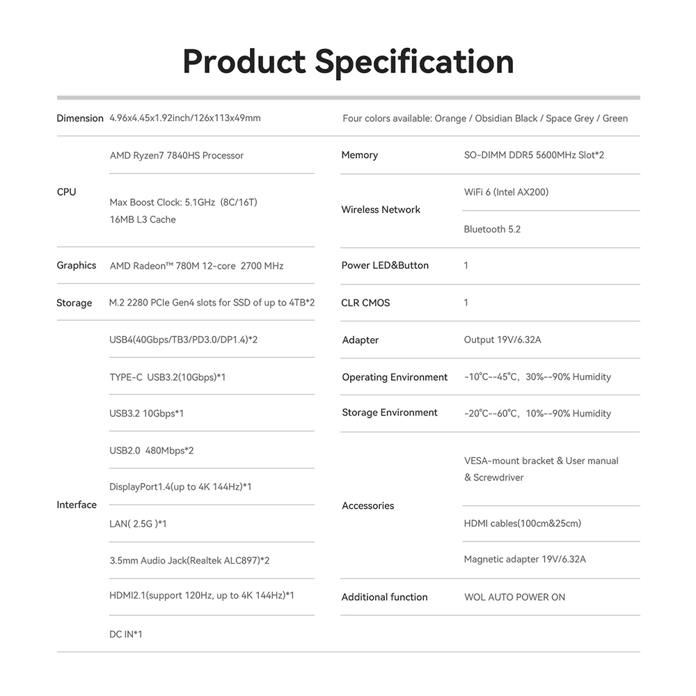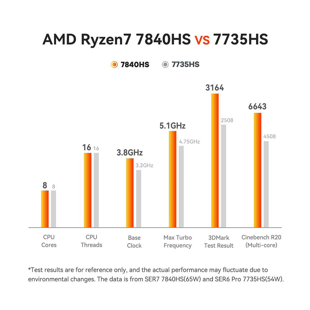 • CPU: AMD Ryzen 7 7840HS offers up to 5.1GHz speed, featuring 8 cores and 16 threads for smooth multitasking and gaming.
