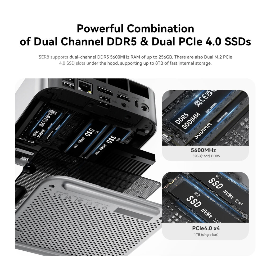 Equipped with dual-channel DDR5 5600MHz RAM, expandable up to 256GB, the Beelink SER8 offers efficient multitasking and quick access to applications. The dual M.2 2280 PCIe 4.0 x4 slots provide ample storage and rapid load times, supporting up to 4TB each, ensuring your data is always at your fingertips.
