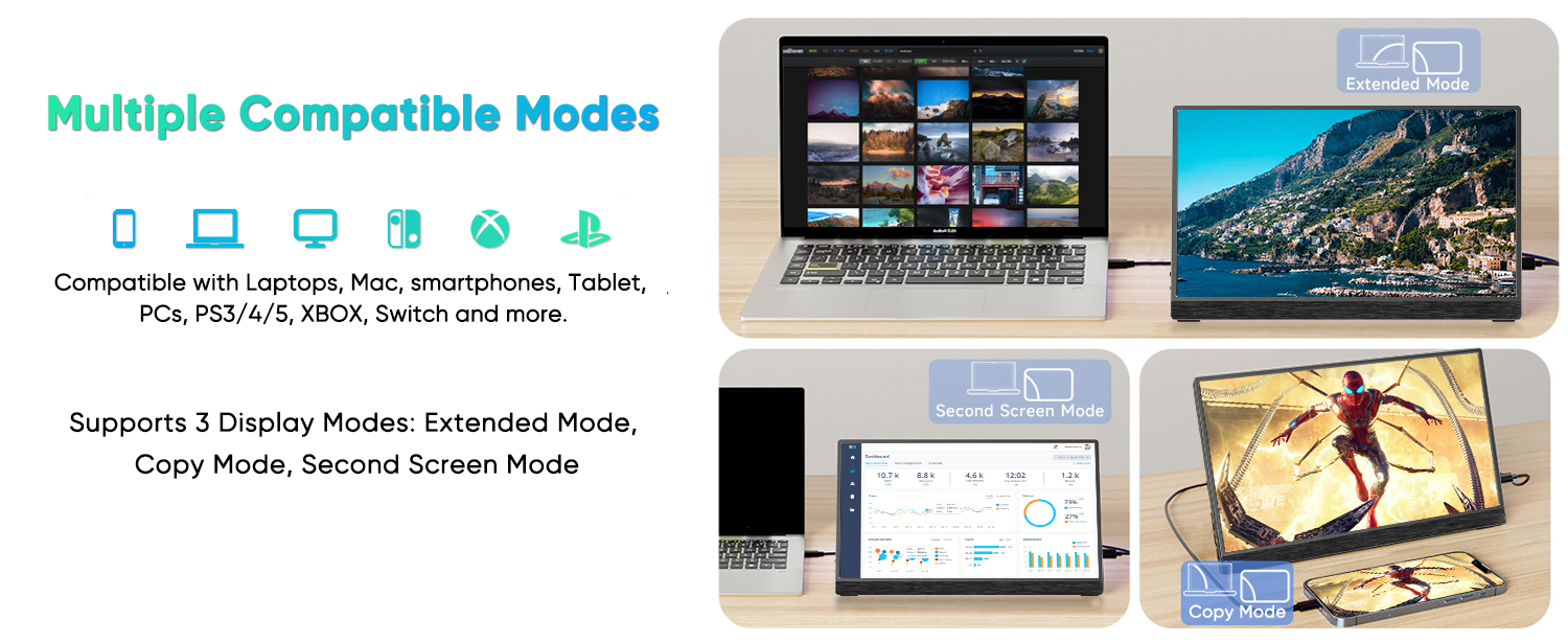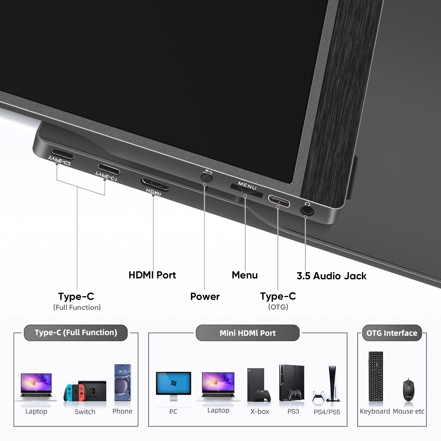Image of the DroiX PM14 Portable Monitor supporting a broad range of HDMI and Type C devices enhancing compatibility across digital ecosystems Ideal for gamers creative professionals on Mac and business professionals needing an extra screen User friendly for Windows with plug and play setup for hassle free use