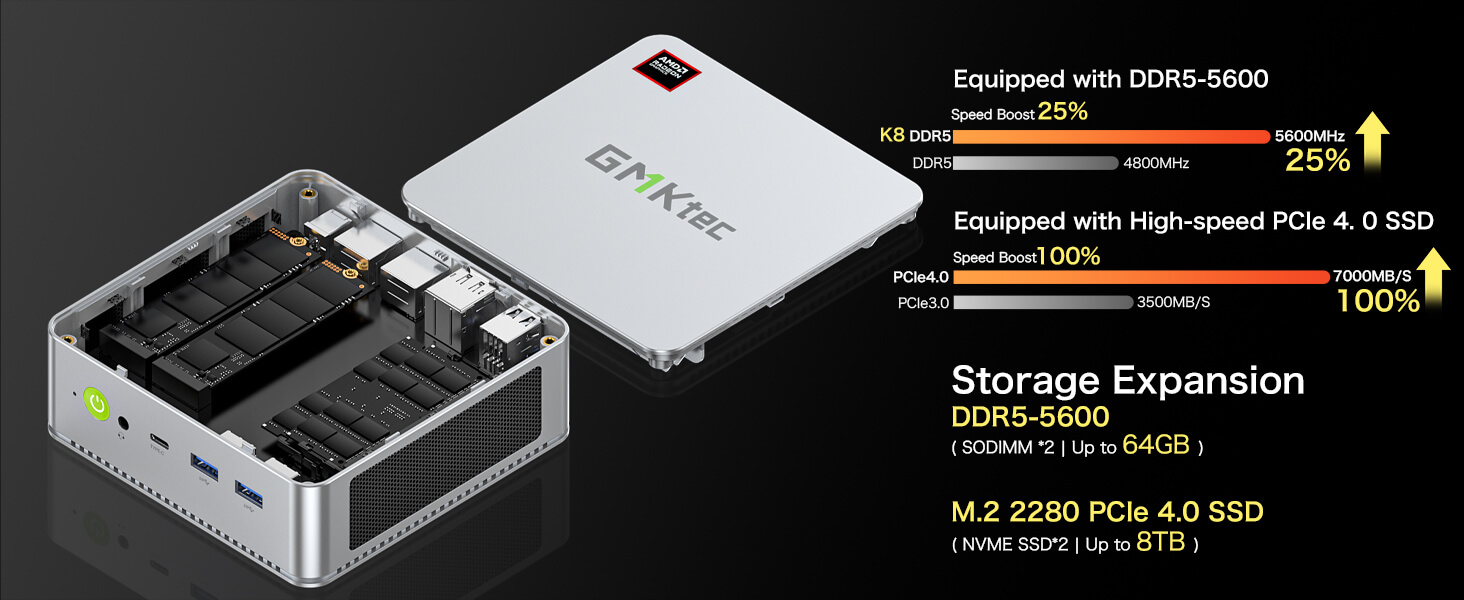 - Memory and Storage – Equipped with 16GB or 32GB of DDR5 5600MHz RAM, the GMKTec NucBox K8 offers rapid data access and minimal latency, making it ideal for intensive tasks and applications. The two SODIMM slots allow for memory expansion up to 64GB, providing ample room for future upgrades. The 1TB PCIe 4.0 M.2 2280 SSD ensures fast boot times and quick access to your files, while also supporting storage expansion up to 4TB. This combination of high-speed RAM and expansive storage capacity makes the NucBox K8 perfect for gaming, creative work, and business applications.