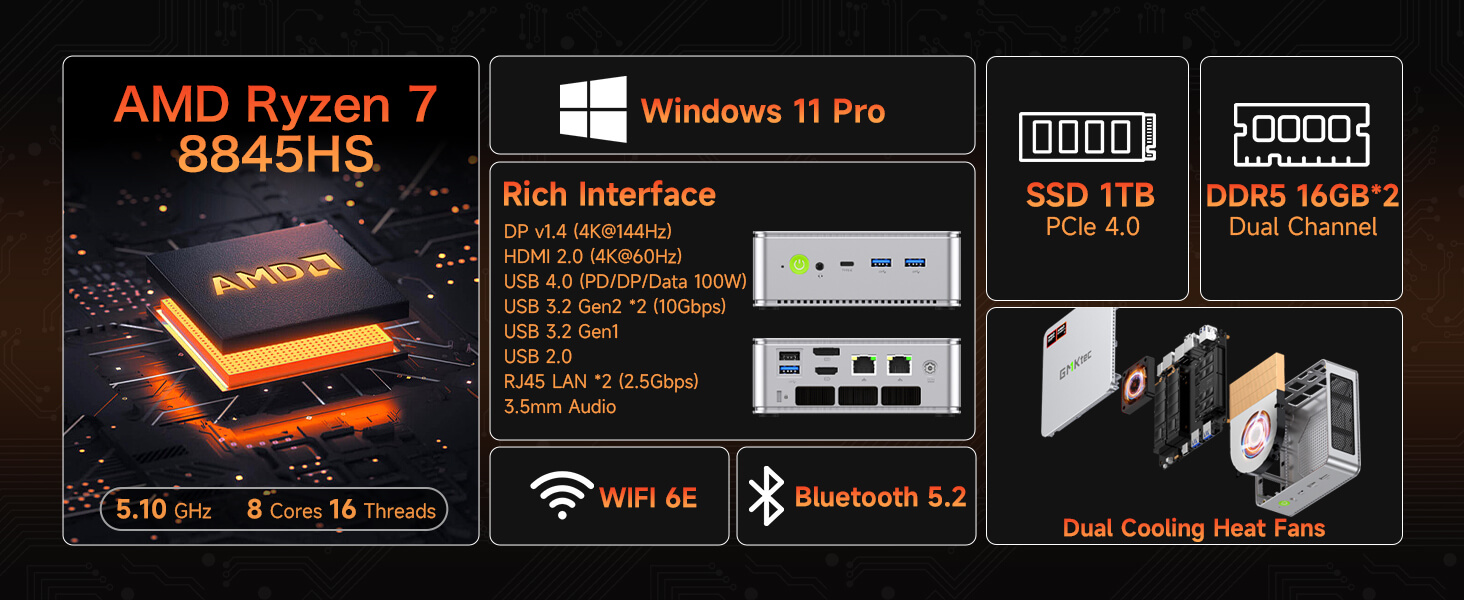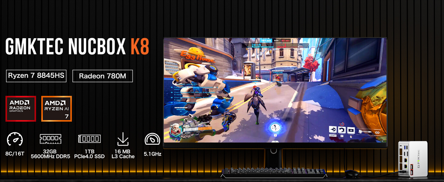 - Performance – At the heart of the GMKTec NucBox K8 is the AMD Ryzen 7 8845HS processor. Built on a 4nm process, the AMD compact computer offers a base clock of 3.8GHz and can turbo boost up to 5.1GHz. Its 8-core, 16-thread architecture, combined with 8MB of L2 and 16MB of L3 cache, provides exceptional multi-tasking capabilities and lightning-fast processing speeds. The Radeon Graphics with 12 cores running at 2800 MHz further enhance performance, ensuring smooth visuals and efficient rendering for both creative and professional applications.