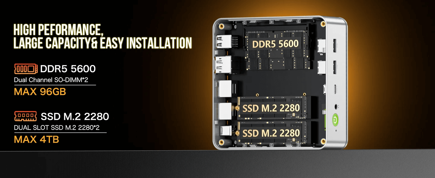 - Memory and Storage – Equipped with 32GB of DDR5 RAM, the GMKTec NucBox K9 offers high-speed memory capable of handling multiple applications simultaneously. The SO-DIMM slots allow for easy upgrades, supporting up to 96GB of RAM. Storage is handled by a 1TB M.2 2280 PCIe 4.0 SSD, which ensures quick boot times and fast data access. The device supports storage expansion up to 4TB, providing ample space for all your files and applications. This makes the NucBox K9 an ideal choice for users who need a reliable and fast storage solution, enhancing game load times and overall performance.