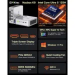 The GMKTec NucBox K9 is designed for those who need a high-performance computer without compromising on space. Featuring the powerful Intel Core Ultra 125H CPU, this mini PC with Intel processor delivers top-notch performance with 14 cores and 18 threads, capable of reaching speeds up to 4.5GHz. Coupled with Intel Arc graphics running at 2.2GHz, the NucBox K9 ensures smooth and responsive performance, whether you’re working on intensive tasks or enjoying multimedia entertainment.