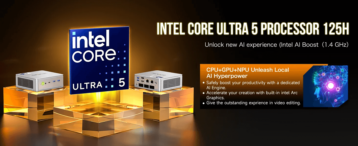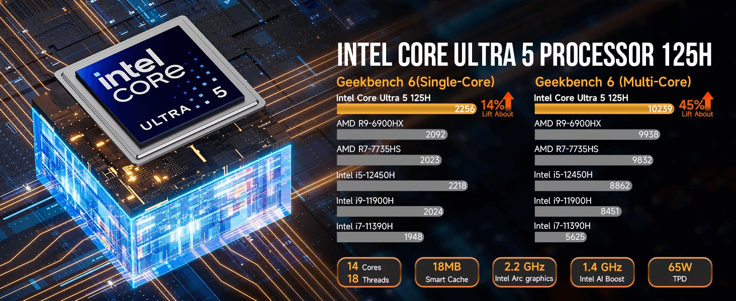 - Performance – The GMKTec NucBox K9 is powered by the Intel Core Ultra 125H, a 14-core, 18-thread processor built on a 4nm process. With a base clock speed of 3.6GHz and a maximum turbo boost of 4.5GHz, this mini PC for business handles demanding applications with ease. The CPU’s 18MB cache and configurable TDP of 28-65W ensure efficient power usage without sacrificing performance. The integrated Intel Arc graphics at 2.2GHz provide robust support for gaming and multimedia tasks, delivering stunning visuals and smooth playback.