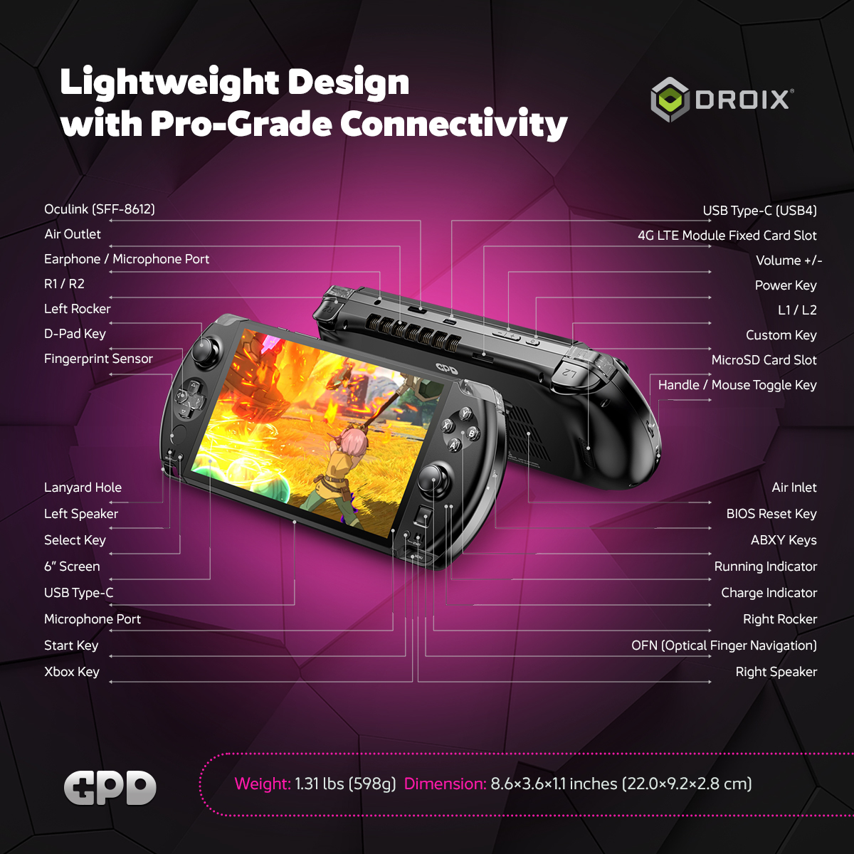 The GPD WIN 4 2025 showcases the pinnacle of portable gaming technology. Weighing just 598g and measuring 8.6 x 3.6 x 1.1 inches, this handheld gaming PC is designed for ultimate comfort and portability. Whether in your hands or tucked into your bag, it’s ready to accompany you wherever you go. The sleek slide-up keyboard unlocks limitless gaming potential, making it perfect for gaming on the go or immersive play sessions at home.