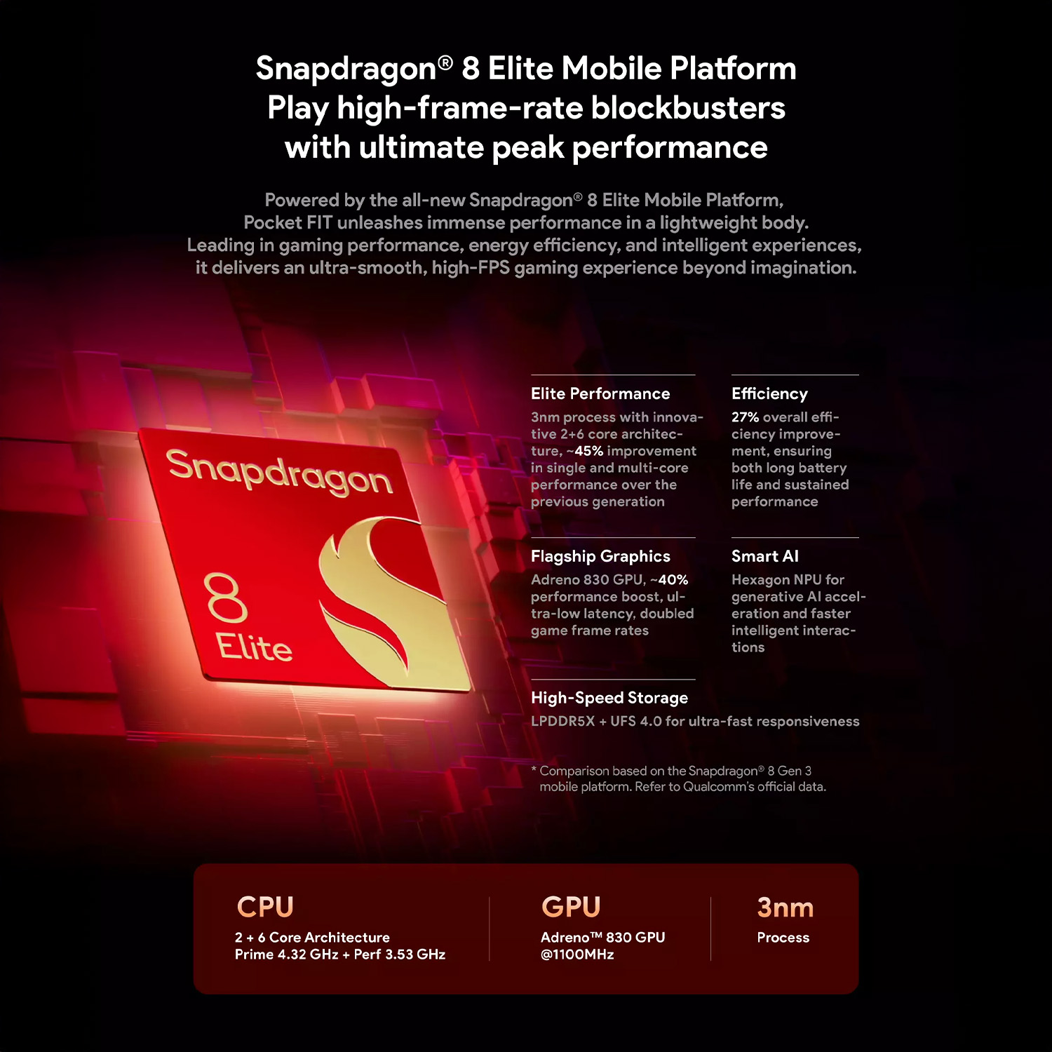 At the heart of the KONKR Pocket FIT, you have a choice between two of Qualcomm’s most powerful platforms. The Snapdragon® G3 Gen 3 is engineered specifically for gaming, delivering sustained high-fidelity performance across the most graphically intensive Android titles. Alternatively, the Snapdragon® 8 Elite offers the pinnacle of mobile computing power for users who demand the absolute best in both gaming and high-performance applications. Whichever you choose, this raw power is tamed by a sophisticated cooling system, featuring a large cooling fan, a wide-area copper heatsink, and extensive cooling fins, ensuring the device runs at peak performance without thermal throttling.