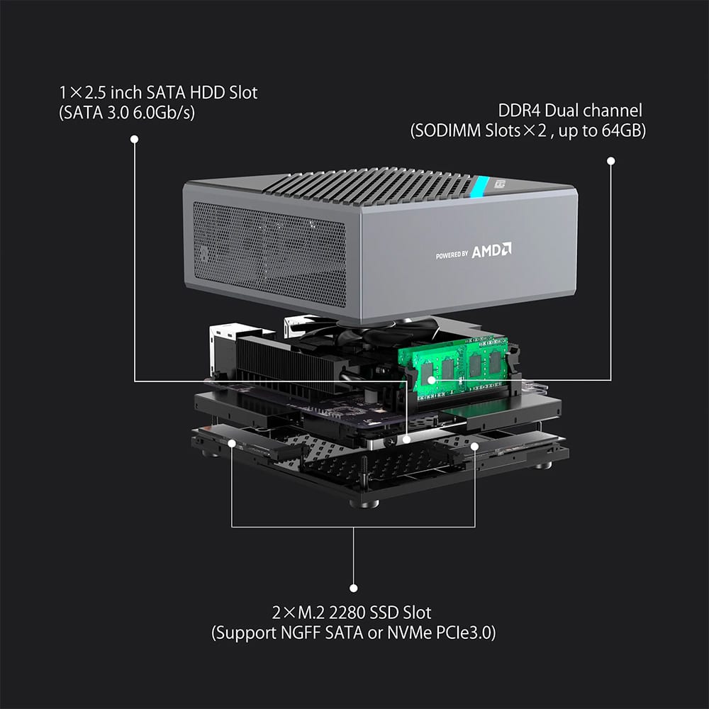 Up to 64GB of DDR4 Dual Channel RAM can be installed. The Minisforum Elitemini B550 has support for up to 2TB M.2 2280 SSD with an additional slot for extra storage. There is also space inside the mini PC for a 2.5” HDD or SSD for additional storage.