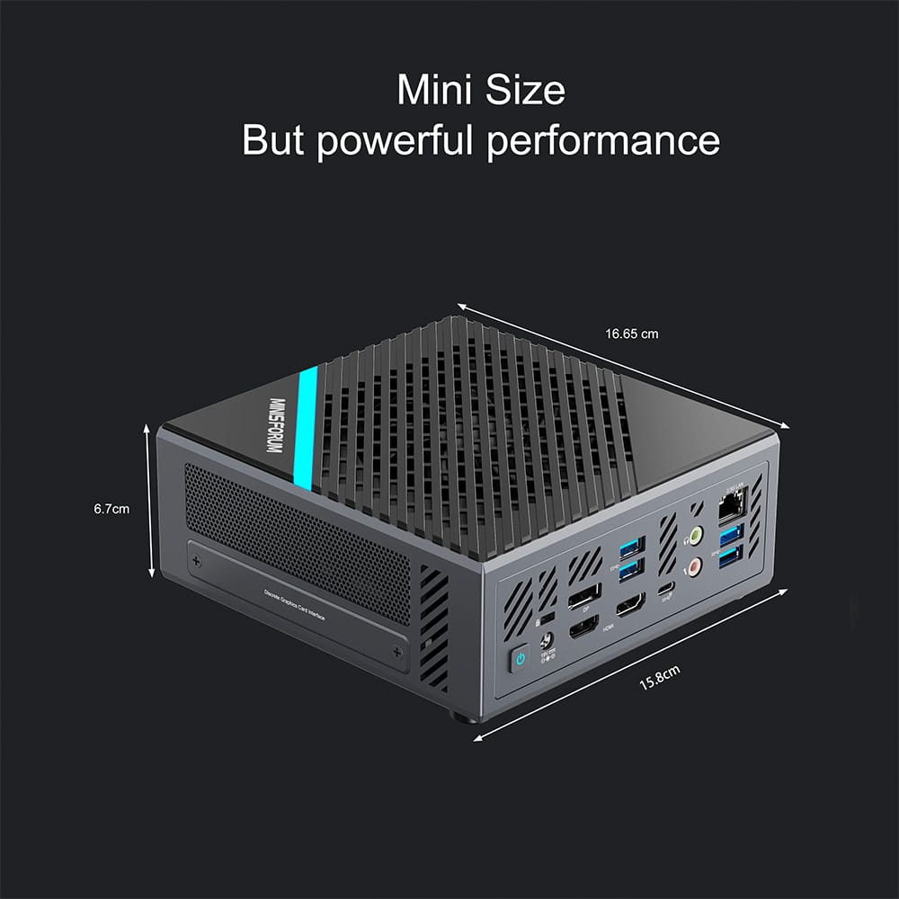 Measuring only 7.4 x 6.5 x 2.6 inches (15.8 x 16.65 x 6.7 cm) and weighing 1129 grams, the Minisforum Elitemini B550 mini PC takes up minimal space on your desktop and is also very portable for travelling between office meetings or longer term travel.