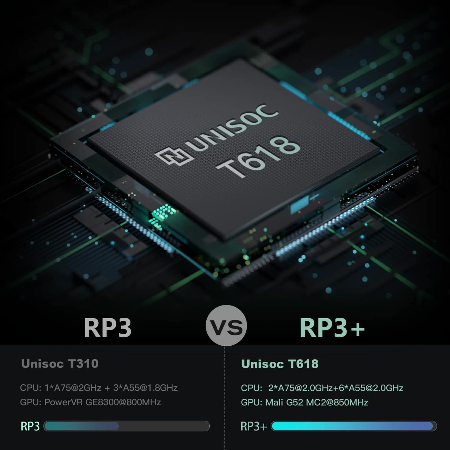 The Retroid Pocket 3+ handheld gaming console features the Unisoc Tiger T618 octa-core processor with 2x A75 @2.0GHz and 6x A55 @2.0GHz cores. Combined with the Mali G52 MC2 running at 850Mhz, it provides high performance at lower power consumption.