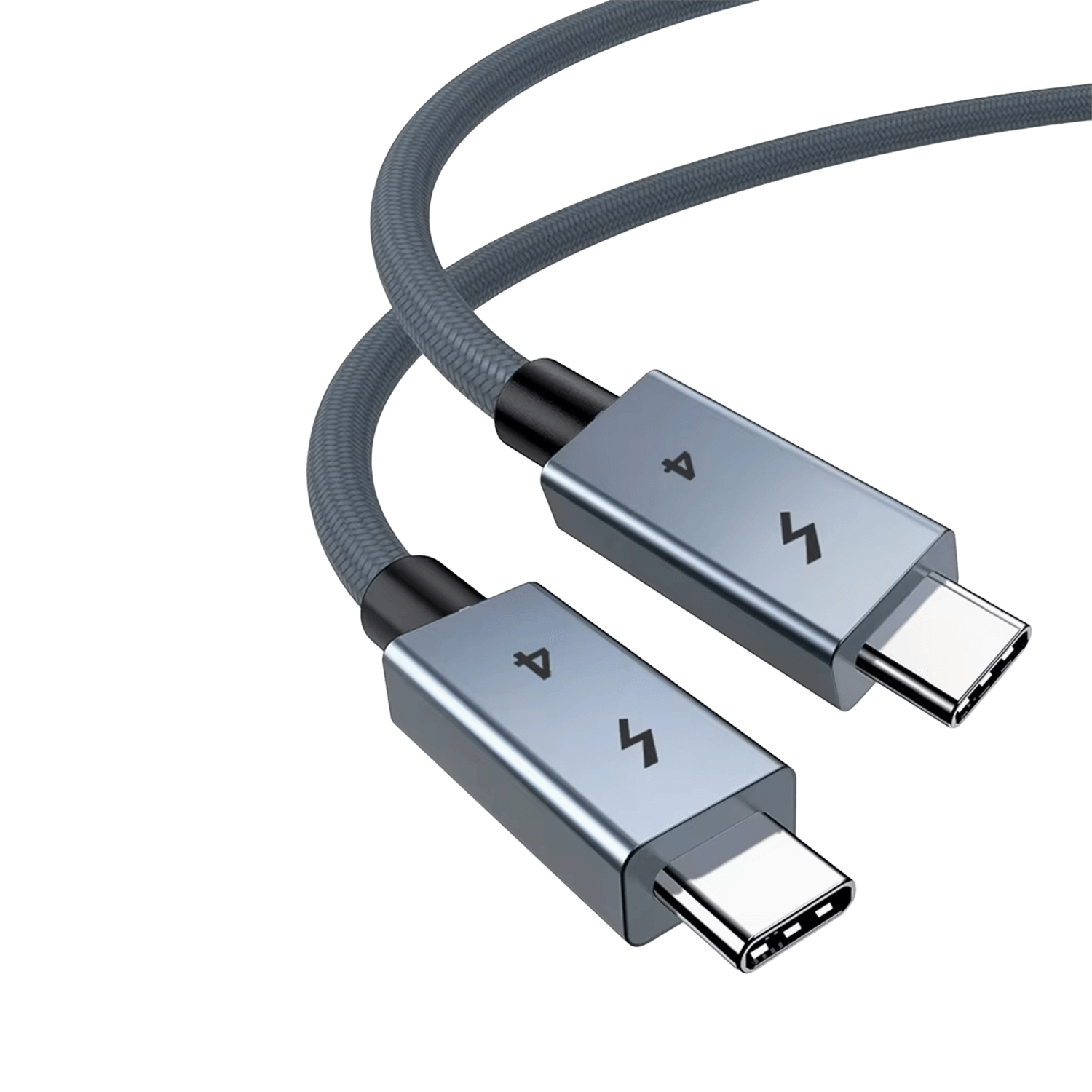 A close up of a high quality USB 4 cable featuring two USB C connectors with space grey metallic housings The connectors are engraved with a lightning bolt icon and the number 4 The cable itself has a durable grey braided nylon jacket shown curved against a plain white background